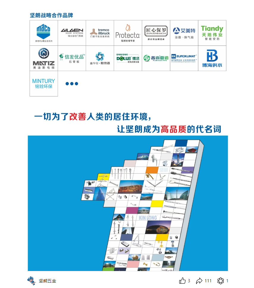 堅朗五金作為一家A股上市公司,是建筑行業領先的配套集成供應商。堅朗生產基地建筑面積超過90萬㎡,公司員工總數超過16000人,60多家子公司。公司在國內外設有近1000個銷售服務機構,產品遠銷100多個國家和地區。經過多年的發展,堅朗已成為建筑領域的著名品牌。